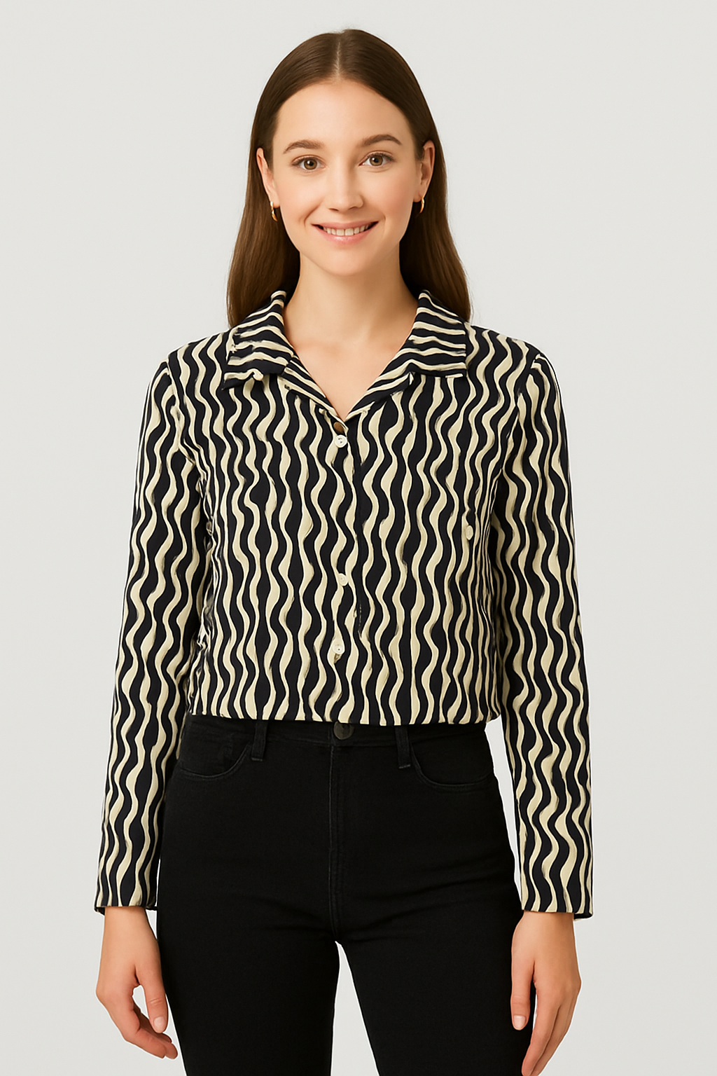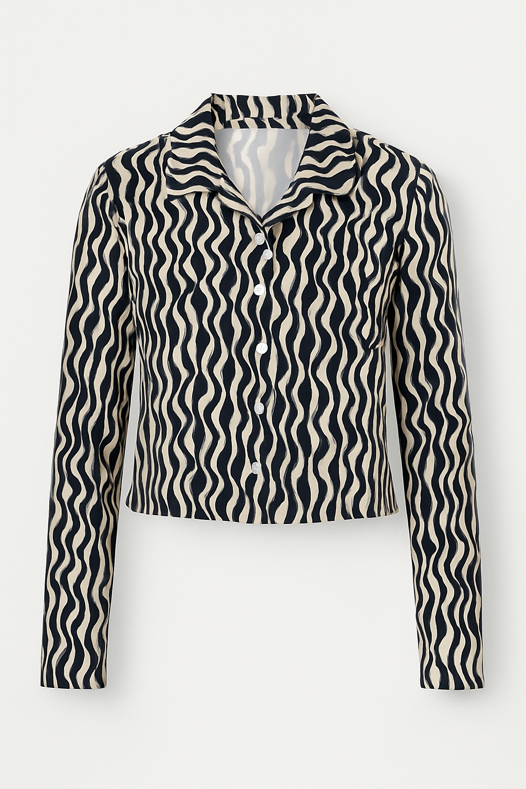Con un diseño audaz y elegante, esta blusa de manga larga se convierte en una pieza clave para elevar cualquier look. Su estampado en blanco y negro con ondas abstractas aporta una estética moderna y con personalidad, ideal para quienes buscan destacarse sin perder sofisticación.