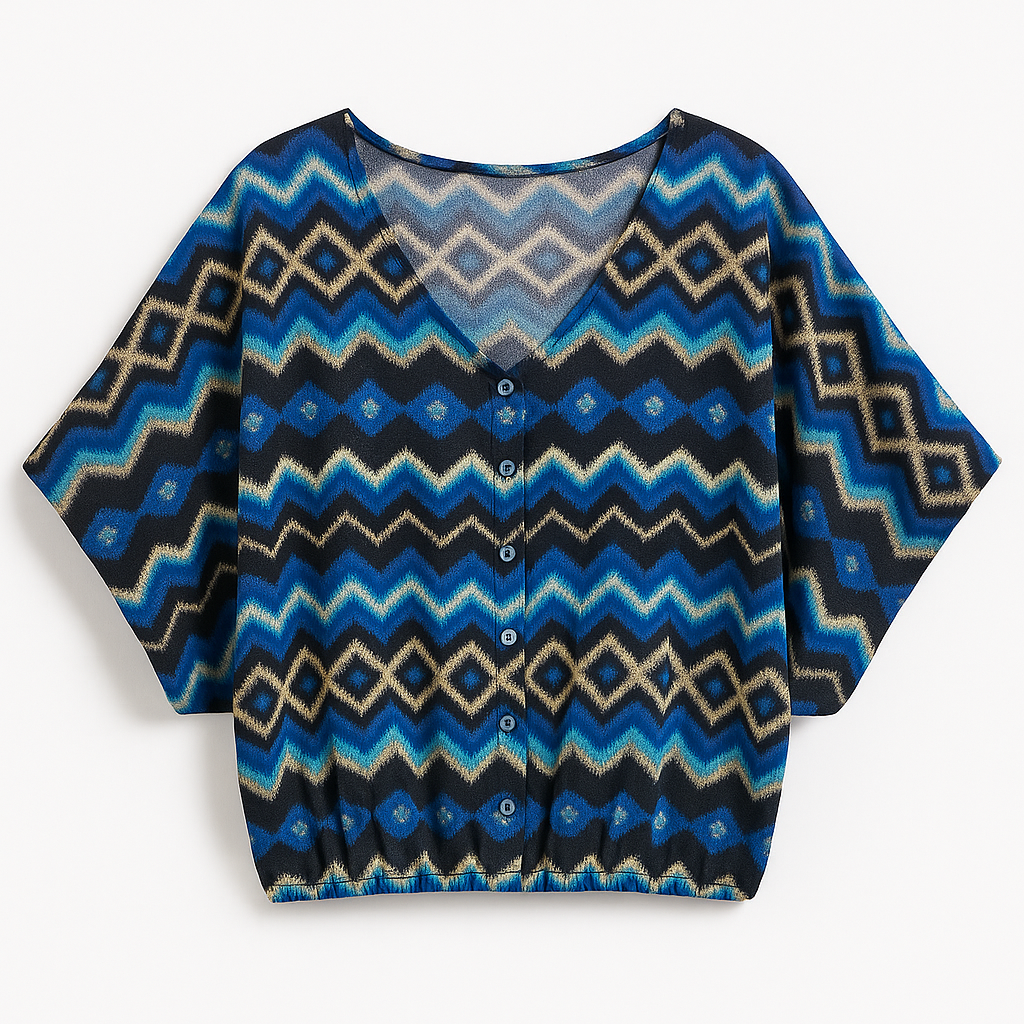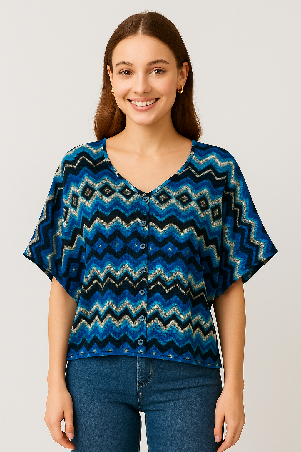 Llevá el color a tu outfit con esta blusa de diseño vibrante y silueta relajada. Su estampado zigzag en tonos azules, negros y dorados, sumado a su corte suelto con mangas amplias, la convierten en una prenda cómoda y versátil para cualquier momento del día.