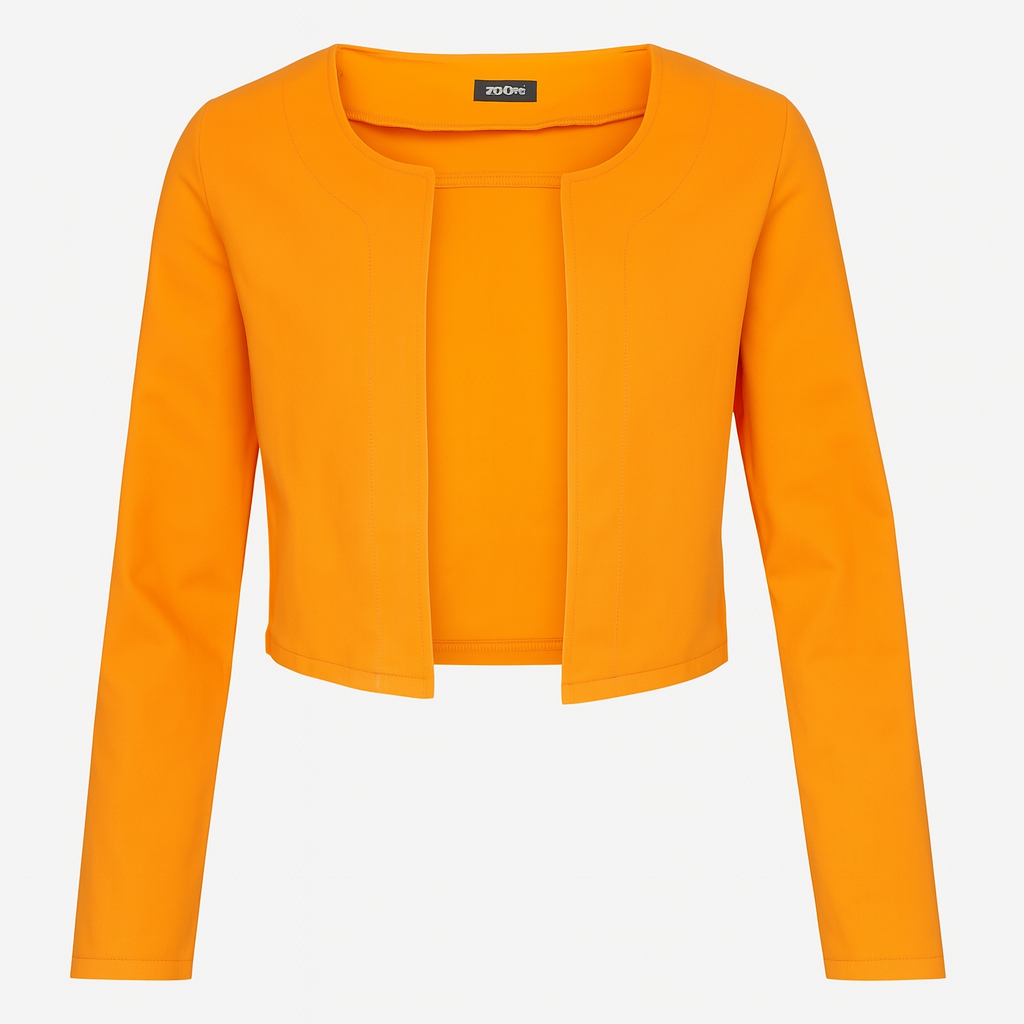 Color, energía y diseño minimalista. Este saco corto en tono naranja vibrante es ideal para destacar cualquier conjunto, ya sea para una reunión, una salida o un look de oficina descontracturado. Su corte limpio sin cierre aporta modernidad y versatilidad para combinar con vestidos, pantalones o faldas.