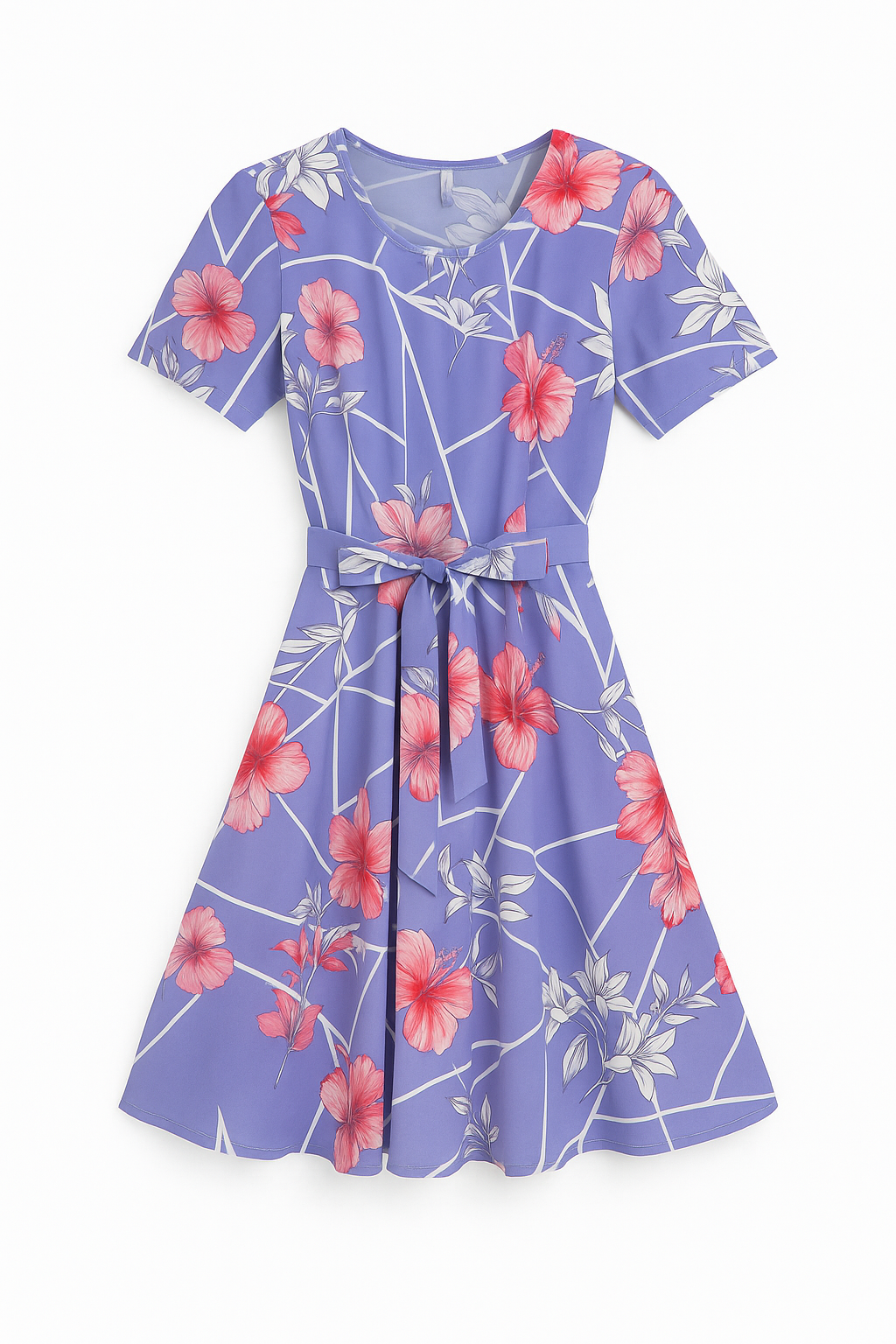 Este vestido corto de base lila con estampado de flores hibiscus en tonos rosados y lilas es ideal para lucir fresca, alegre y femenina. Su corte evasé realza la silueta con movimiento natural, mientras que el lazo a la cintura permite ajustarlo a gusto. Con mangas cortas y escote redondo, es una opción versátil para el día o la tarde.