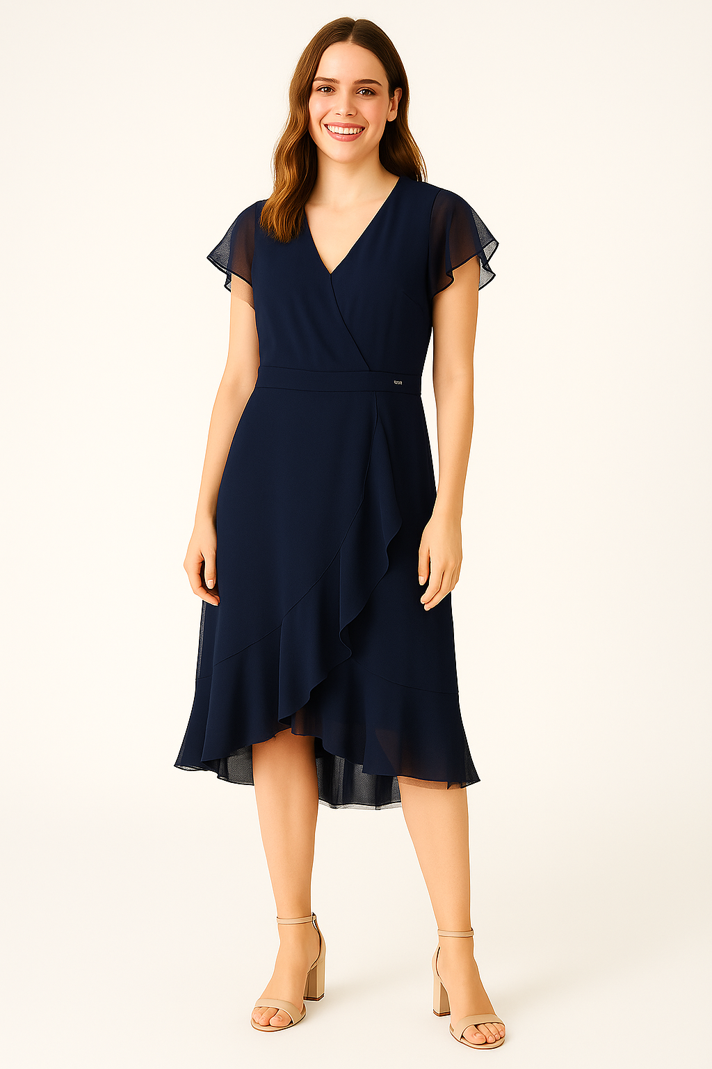 Elegante vestido midi confeccionado en gasa azul marino, ideal para eventos y ocasiones especiales. Su diseño cruzado realza la silueta con delicadeza, mientras que las mangas con aplicaciones de tul aportan un toque romántico y sofisticado. La falda con caída fluida y doble capa de volados con tul en el bajo otorga movimiento y ligereza al caminar.
